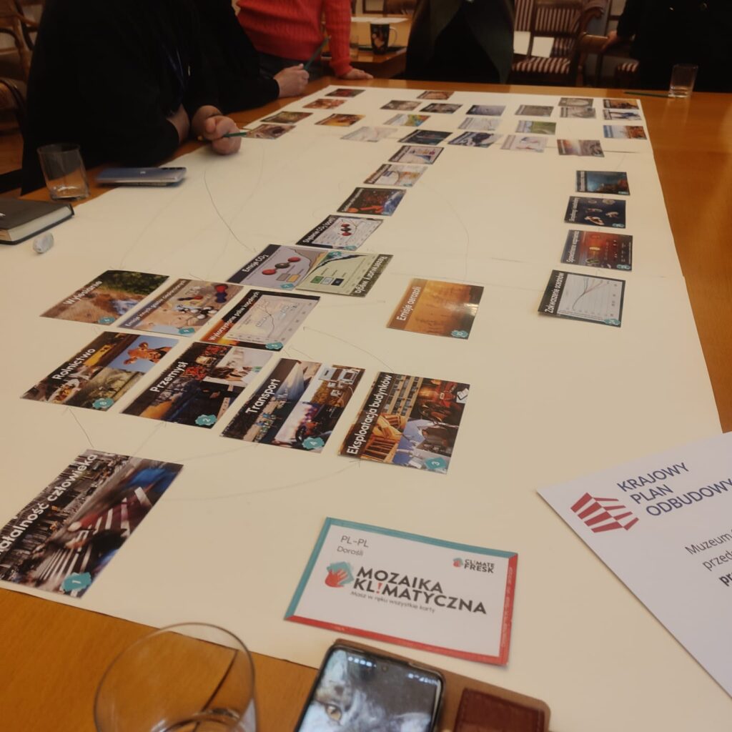 Szkolenie polegało na pracy w grupie i układaniu specjalnego zestawu kart przedstawiających przyczyny i skutki zmian klimatycznych, tworzących spójną mapę zależności. Z zaangażowaniem dyskutowaliśmy nad tym, jak problemy te dotyczą wszystkich z nas, a to wpłynęło na lepsze zrozumienie złożoności m.in. procesu globalnego ocieplenia. Pod okiem certyfikowanego prowadzącego, dra inż. Przemysława Poszwy, poznaliśmy w praktyce naukowe podstawy zmian klimatu (rolę emisji CO2, efekt cieplarniany, sprzężenia zwrotne), a także konsekwencje społeczne, ekonomiczne i środowiskowe kryzysu klimatycznego.