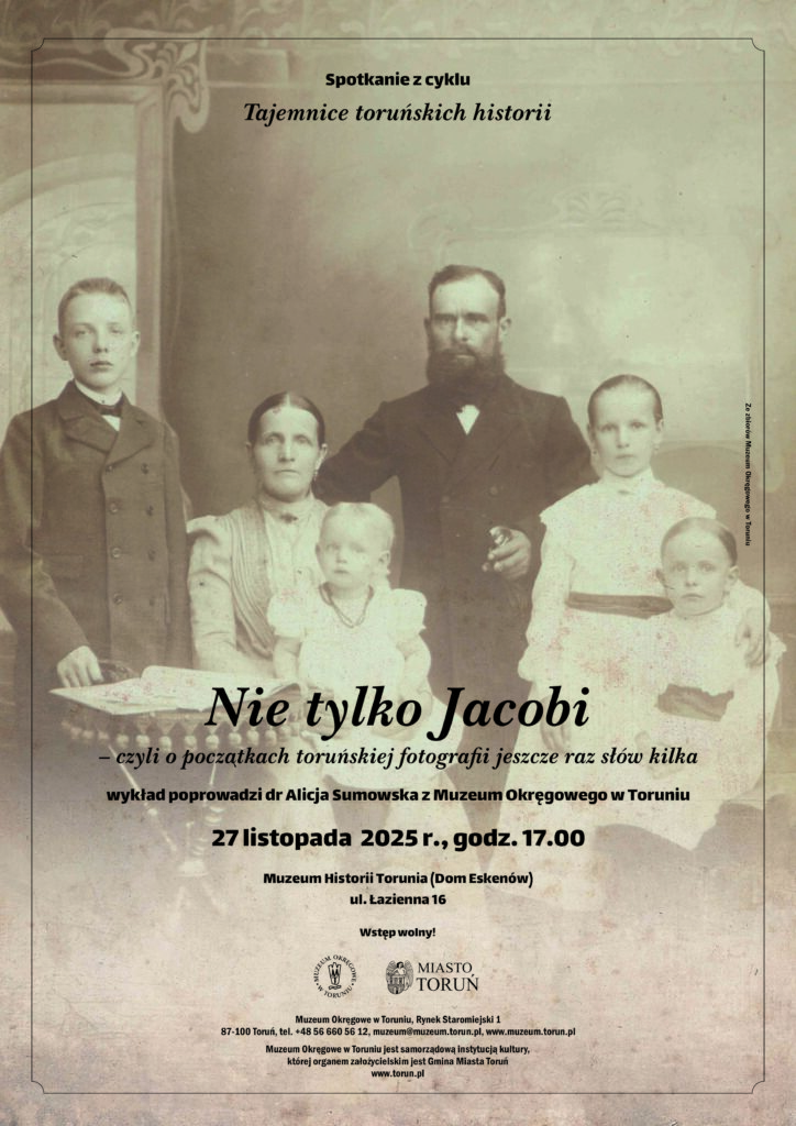 Przy okazji spotkania przypominamy o wystawie, która jest eksponowana w Muzeum Historii Torunia w Domu Eskenów pt. „Śladami Jacobich. Fotografie i obrazy z Torunia”, która przeniesie Państwa w fascynujący świat toruńskiej fotografii XIX i XX w.